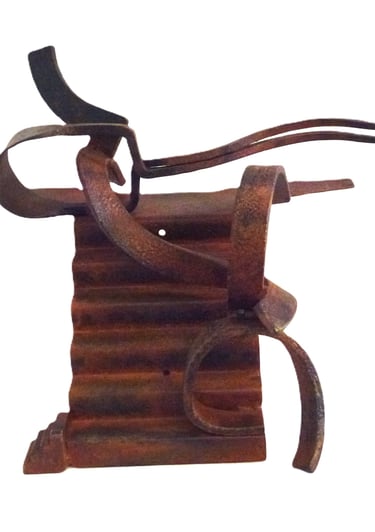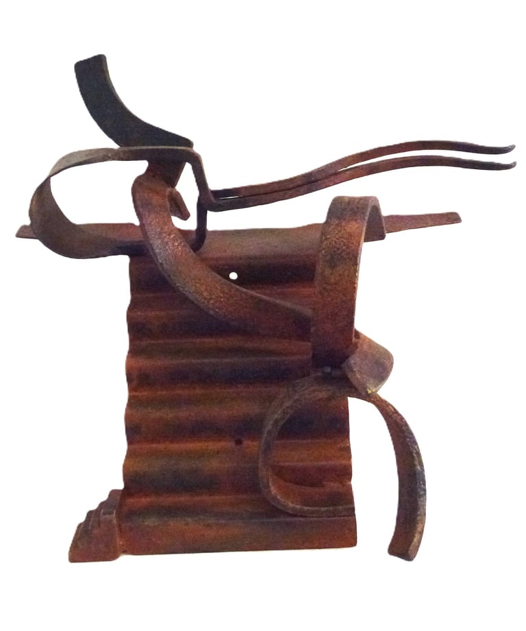 Evocando la “cocina del aprovechamiento” de madre, abuela,…de un tiempo de supervivencias, …., reutilizando chatarras y objetos que esperaban (oxidándose a la intemperie) encontrar una alternativa a su fundición y, al mismo tiempo, evocando los recuerdos de cuando se fabricaron o descartaron (en el taller del padre o del hermano), …doblando, cortando, soldando, … aprovechando la plegadora de chapas que tanto nos costó trasladar, y que se presta al juego de construir mundos de escaleras, como en los cuadros de Escher … probando y buscando con cuál de las múltiples opciones de integración (para cada pieza) el instinto parece decir: “de momento, así vale”. Muy alineado con el “arte encontrado” y las esculturas, como guiños, de Marcel Duschamp, en la idea de dignificar objetos cotidianos que difícilmente origen. Y se considerarían artísticos, modificándolos pero sin ocultar su cercano al “ensamblaje artístico”, al “collage tridimensional”, al “arte bruto” (por la falta de formación artística y de cierta racionalidad en el espacio y el momento creativo)